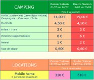 Pitchup : identiquesCamp'in France : 12€ Forfait 2 personnes (uniquement en Basse Saison)Mobile Home : entre 50 et 60€ par nuit et entre 310 et 610€ par semaine